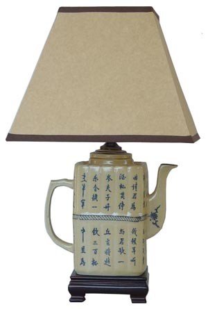 - Measures 18" Tall Top to Bottom- Attractive Asian Accent for Any Room- High Temperature Chinese Ceramic Teapot Lamp Body w/ Hand Appliqué Ming Calligraphy Poem