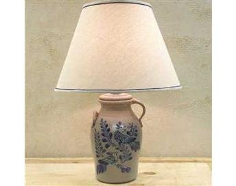 The handled churn lamp features the thrushes pattern and is 14 inches high. Rowe Pottery has adapted Early American storage containers to become illuminating additions to kitchens, dining and living rooms, bedrooms and even bathrooms. To complete the look of the lamp, a matching colbat-trimmed lamp shade is available. Because all salt glazed pottery is handmade and hand painted, you will find originality and uniqueness in each piece. The size, shape, and pattern of each piece will vary. Also, color variations, which occur during the firing process, create the high and low color tones that give your piece its unique character. Natural color tones of the pottery pieces vary ranging from stone gray to tan, with cobalt blue accents.
